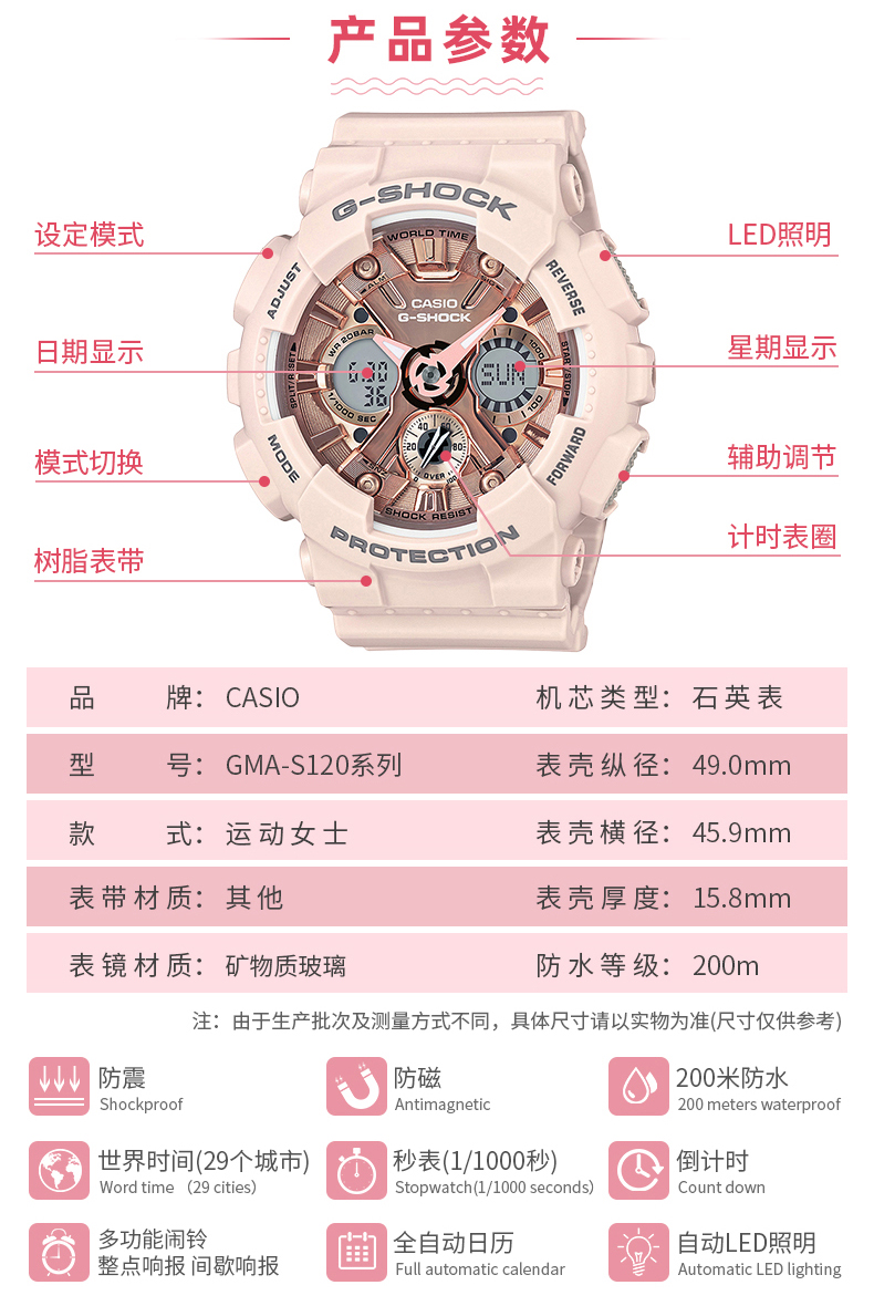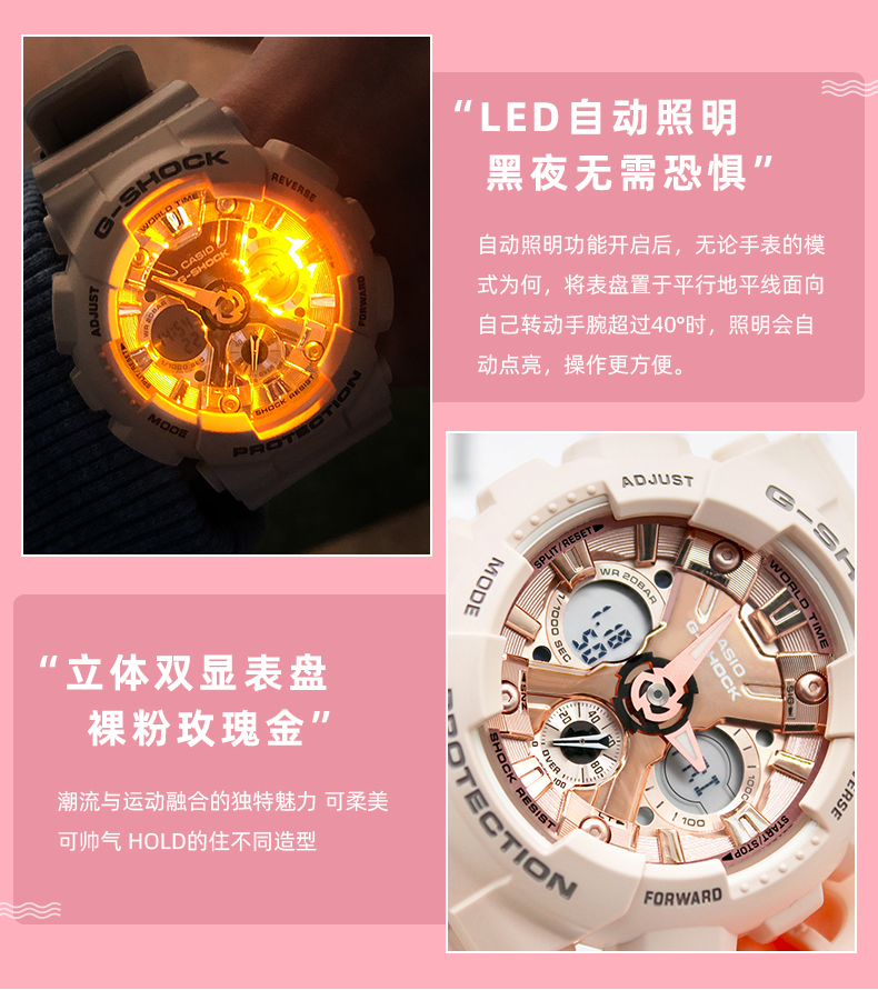 卡西欧手表官方女限量独白虎官网运动樱花粉GMA-S120旗舰店石英表